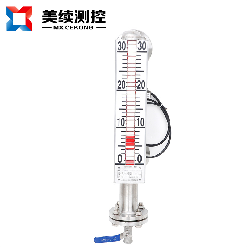 液位計以磁性浮子為測量元件,浮子在測量管內隨液位變化而上、下浮動,通過磁耦合作用,驅動指示器內紅、藍指示管翻轉180°。液位上升時,指示管由藍色轉為紅色;下降時,由紅色轉為藍色,從而實現液位的雙色顯示。當介質溫度≥300℃時,采用白、藍色指示管。