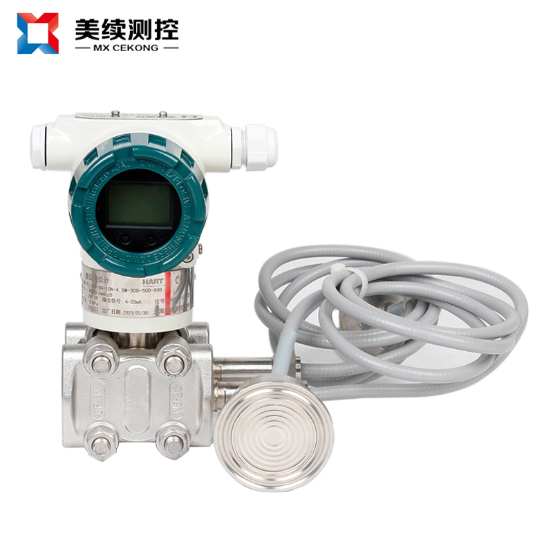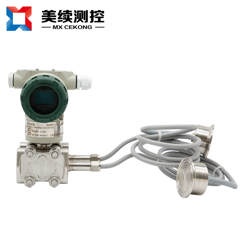 3、當測量具有腐蝕性或含有結晶顆粒,以及粘度大、易凝固等介質的測量時,為解決引壓管線腐蝕或堵塞的問題,可以采用法蘭式差壓變送器的法蘭直接與容器上的法蘭連接,作為敏感元件的測量頭(金屬膜盒)經毛細管與變送器的測量室相連通,在膜盒、毛細管和測量室所組成的封閉系統內充滿硅油,作為傳壓介質,起到變送器與被測介質隔離的作用。