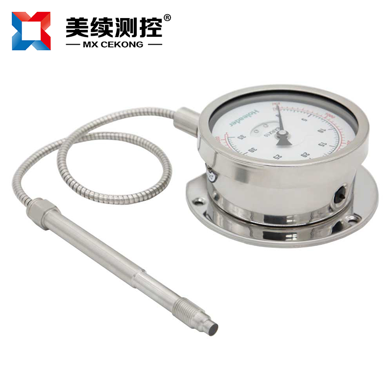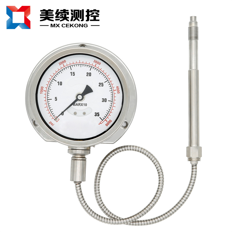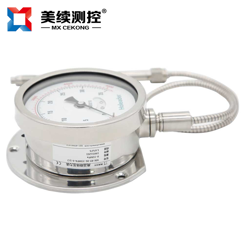 MX-RT-06系列熔體壓力表,其采用了英國進口的高穩定機芯,并且采用膜片隔離、壓力現場指針指示,機械式結構,無需電源供電,原裝進口機芯,在MX-RT-05系列的基礎上又添加了金屬軟線,使表盤可正反安裝,表殼任意360度調整最佳可視角度,廣泛應用于化纖,塑料擠出行業高溫壓力的監測。