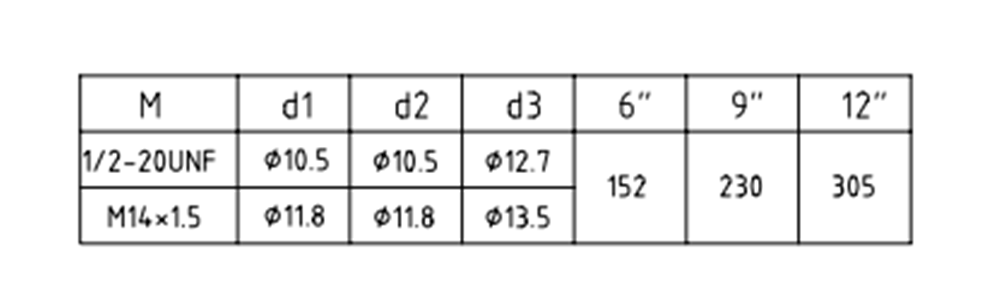 45°斜面密封  | D1 | M12×1.5 | M14×1.5 | 1/2-20UNF | M18×1.5 |