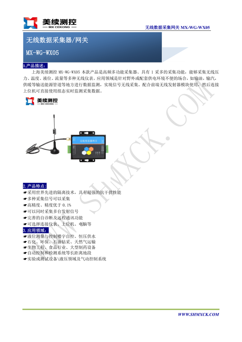 上海美續測控MX-WG-WX05本款產品是高頻多功能采集器、具有1采多的采集功能,能夠采集無線壓力、溫度、液位、流量等多種無線儀表。